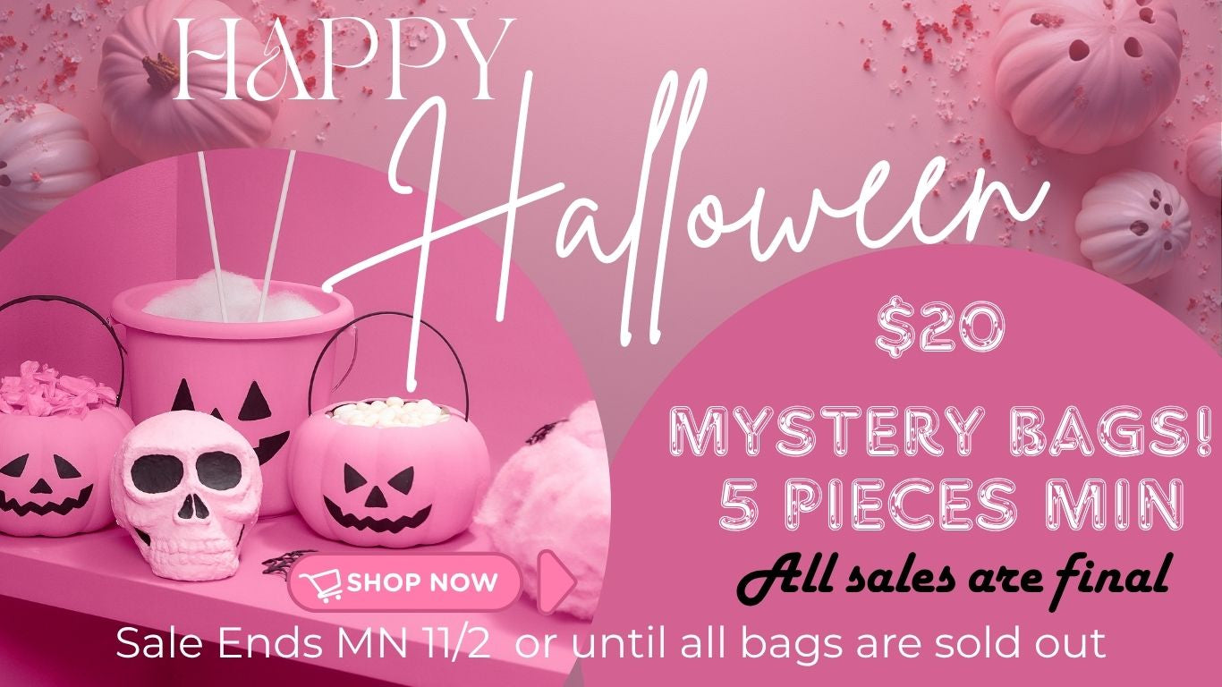 Unbox a surprise with our TRICK OR TREAT Mystery Bag! With 5-6 items inside, you'll get a mix of sizes from Small to 3x items will include clothing and/or accessories ex. Hats, handbag, Jewelry, Sunglasses etc.