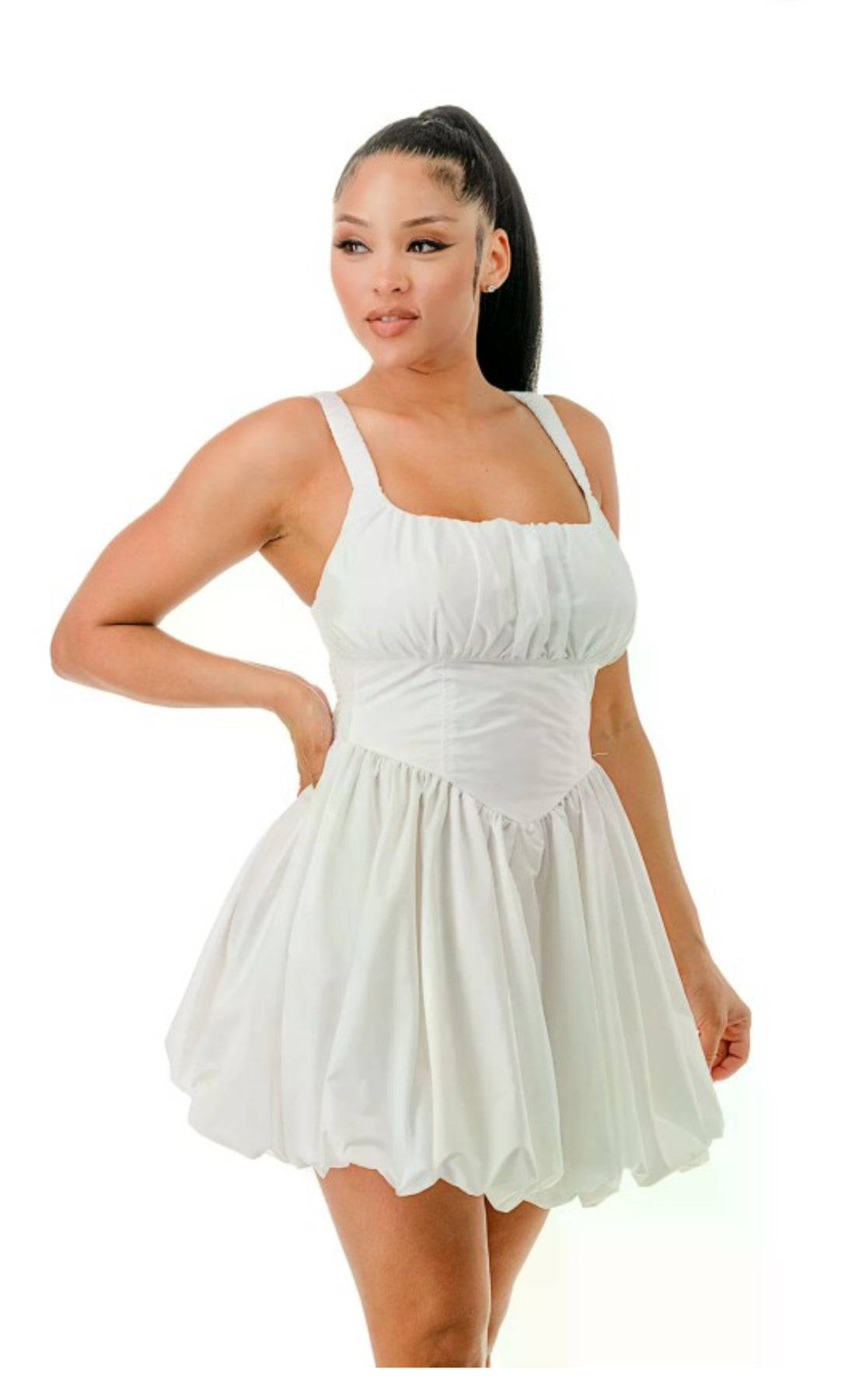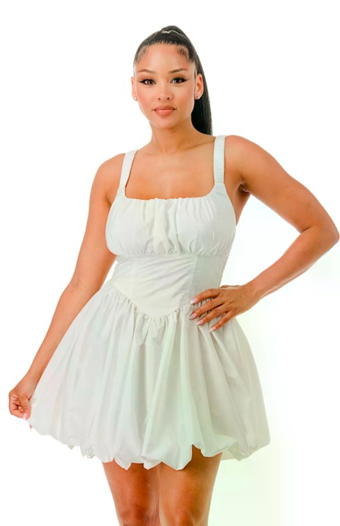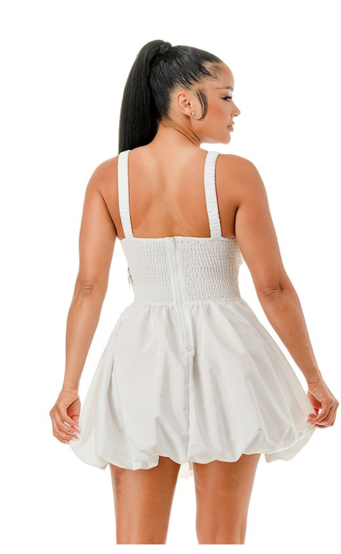 Add a little whimsy to your wardrobe with our White Puff Balloon Dress. This true-to-size dress features a unique balloon hemline, ruched back zipper, and off-white color. Playful and stylish, it's perfect for any occasion. (No pun intended!)