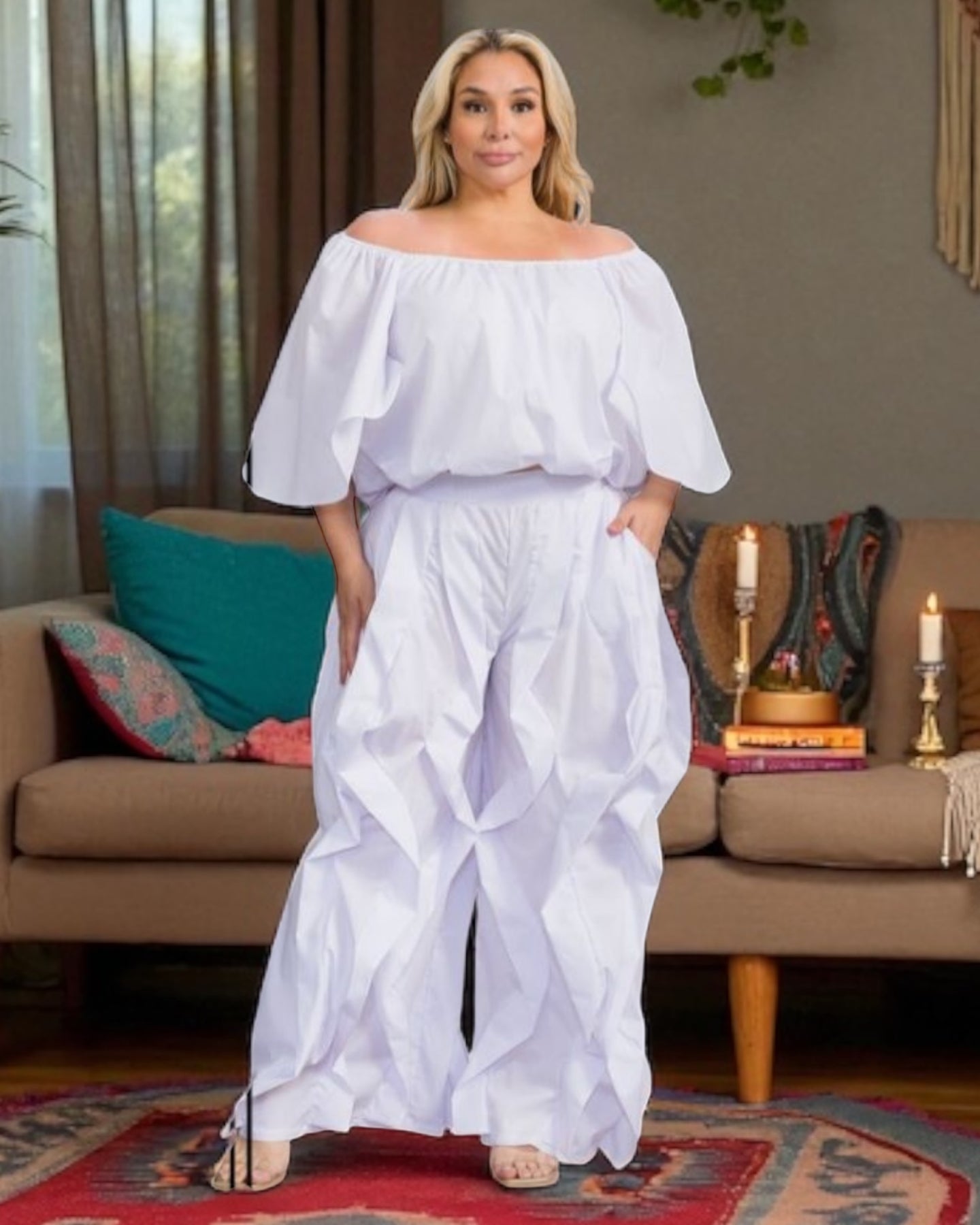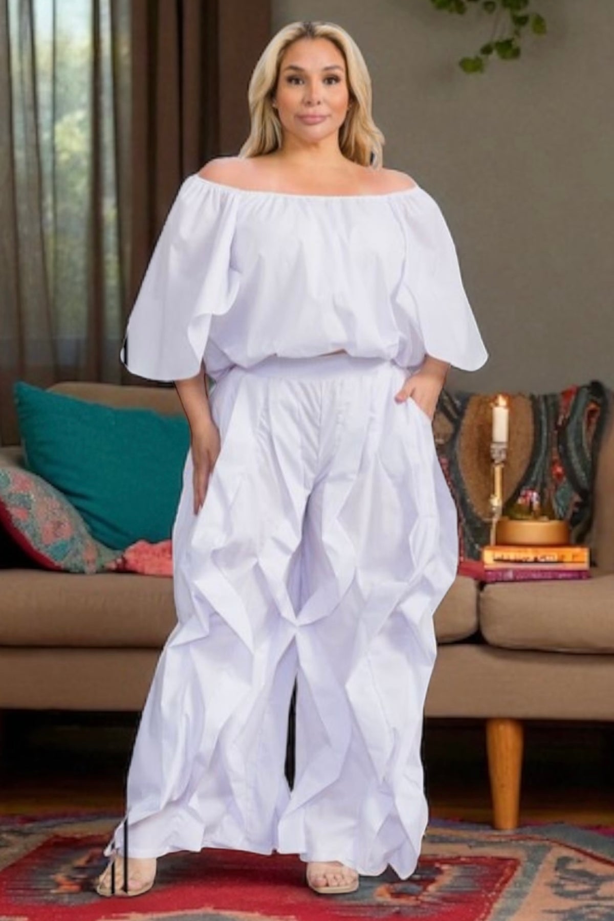 Indulge in effortless elegance with our White Ruffled Pant Set. This versatile set features a ruffled crop top and wide-leg pants with pockets. Wear on or off the shoulder for a chic look that transitions seamlessly from day to night. Be confident and stylish in this must-have set!