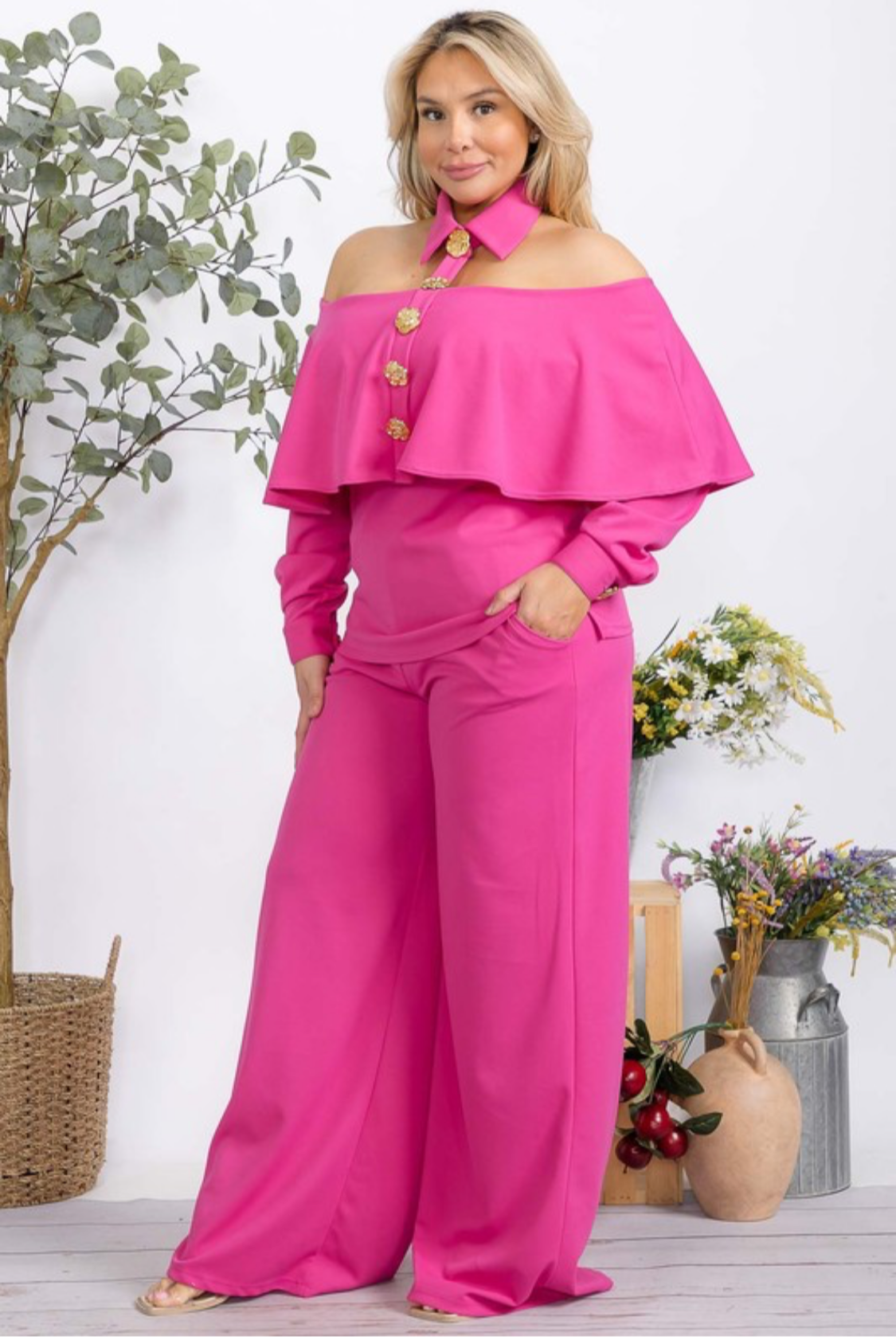 Get ready to make a statement in our Hot Pink Pant Set! This stunning set includes a trendy ruffle off the shoulder top and wide leg pants, both in a bold hot pink color. Stand out from the crowd and exude confidence in this eye-catching ensemble.