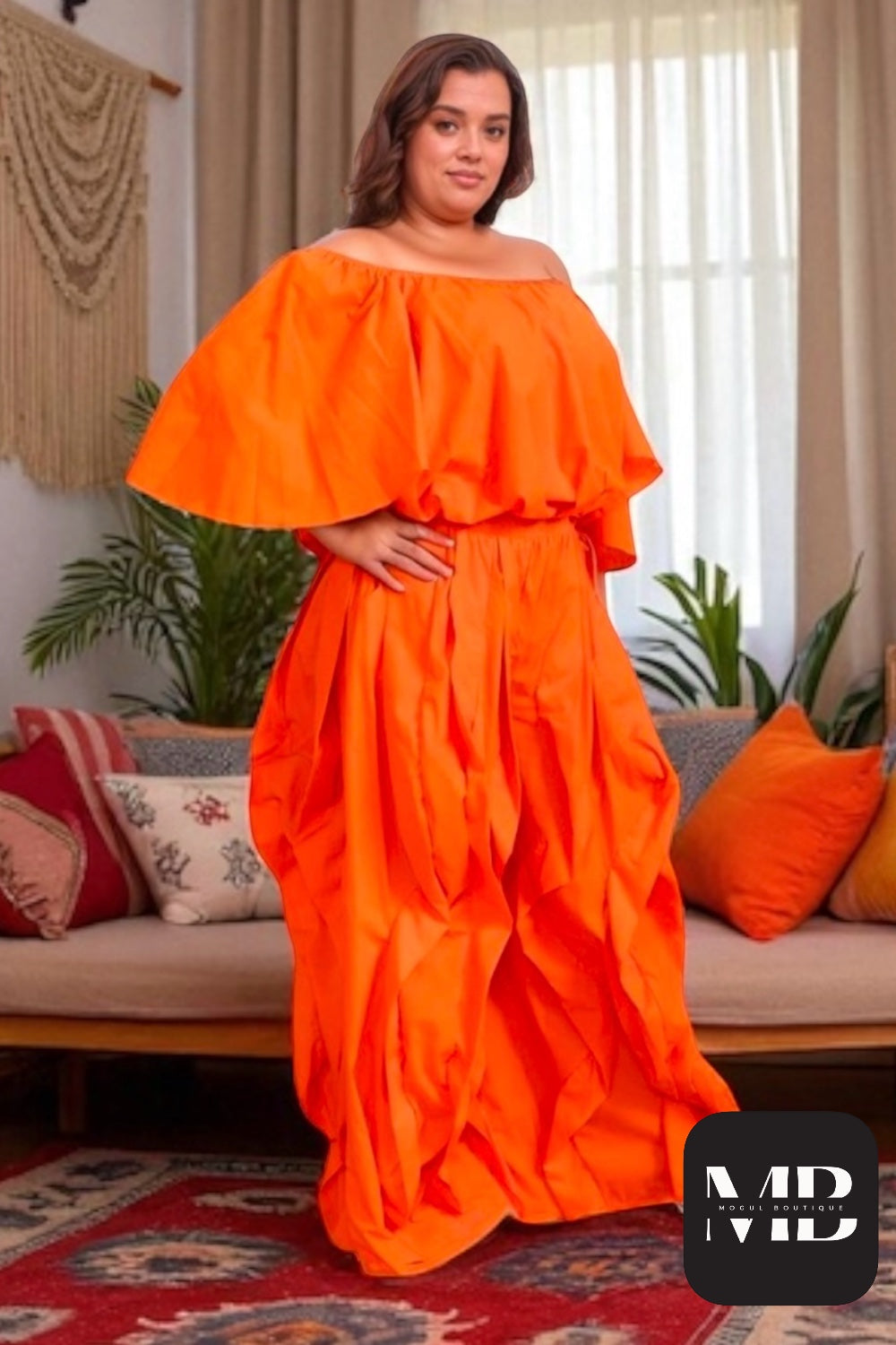 Indulge in effortless elegance with our Orange Ruffled Pant Set. This versatile set features a ruffled crop top and wide-leg pants with pockets. Wear on or off the shoulder for a chic look that transitions seamlessly from day to night. Be confident and stylish in this must-have set!