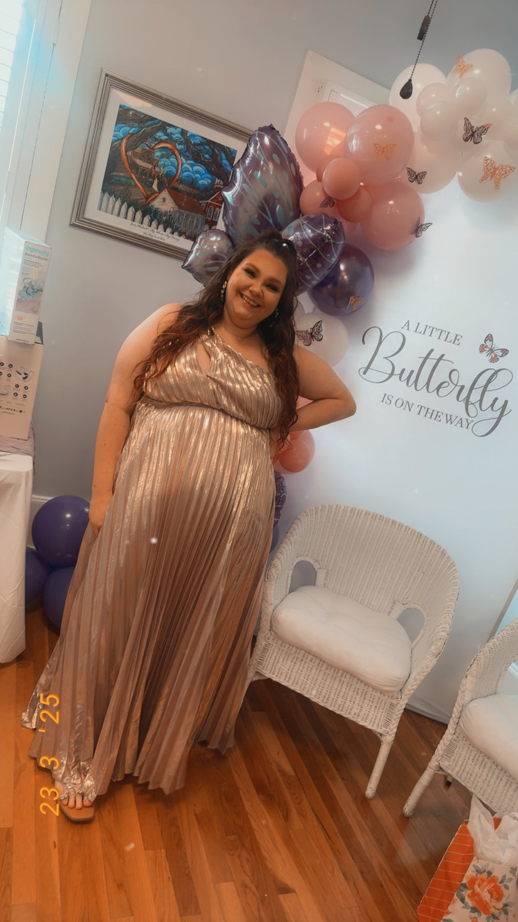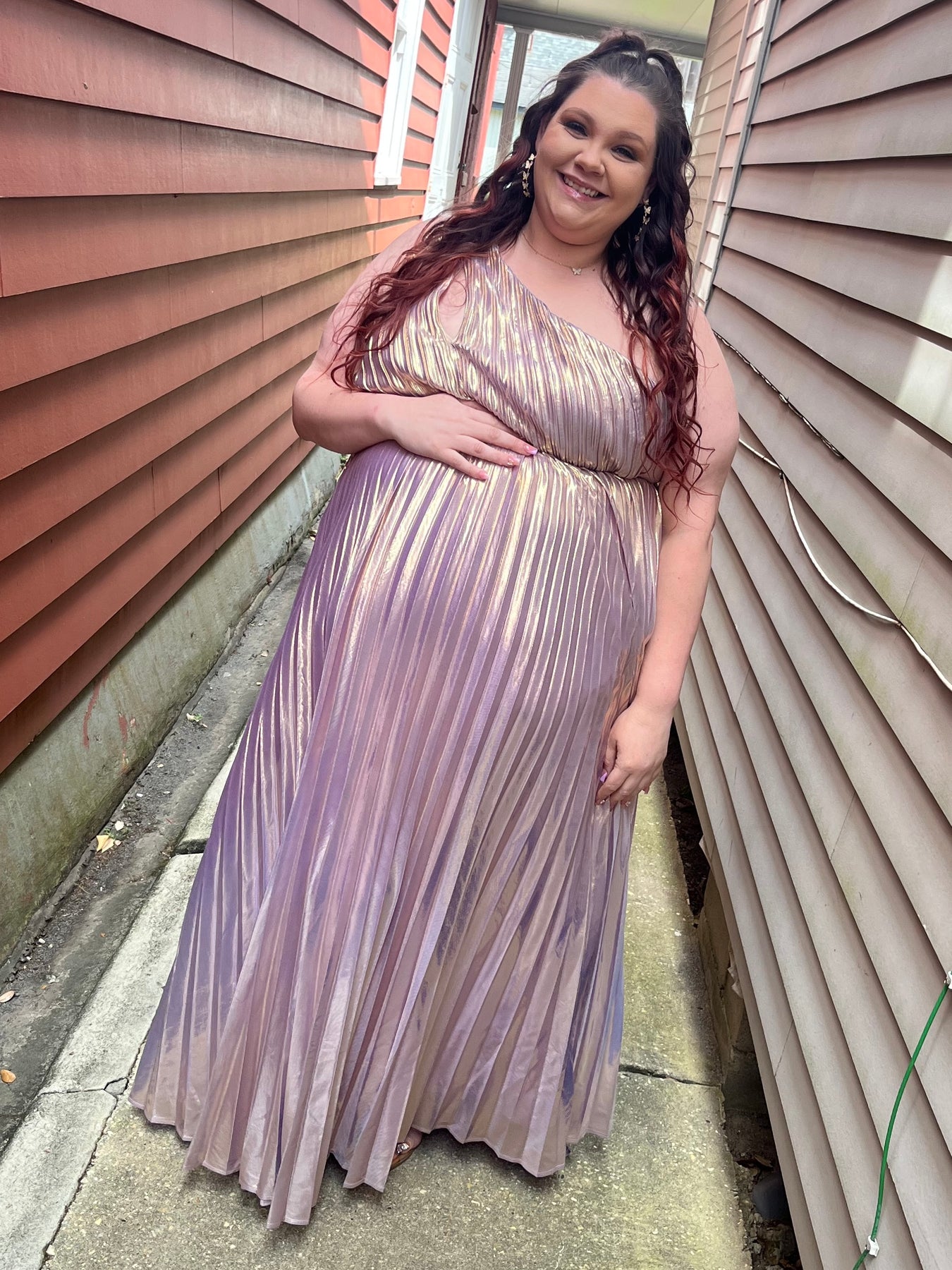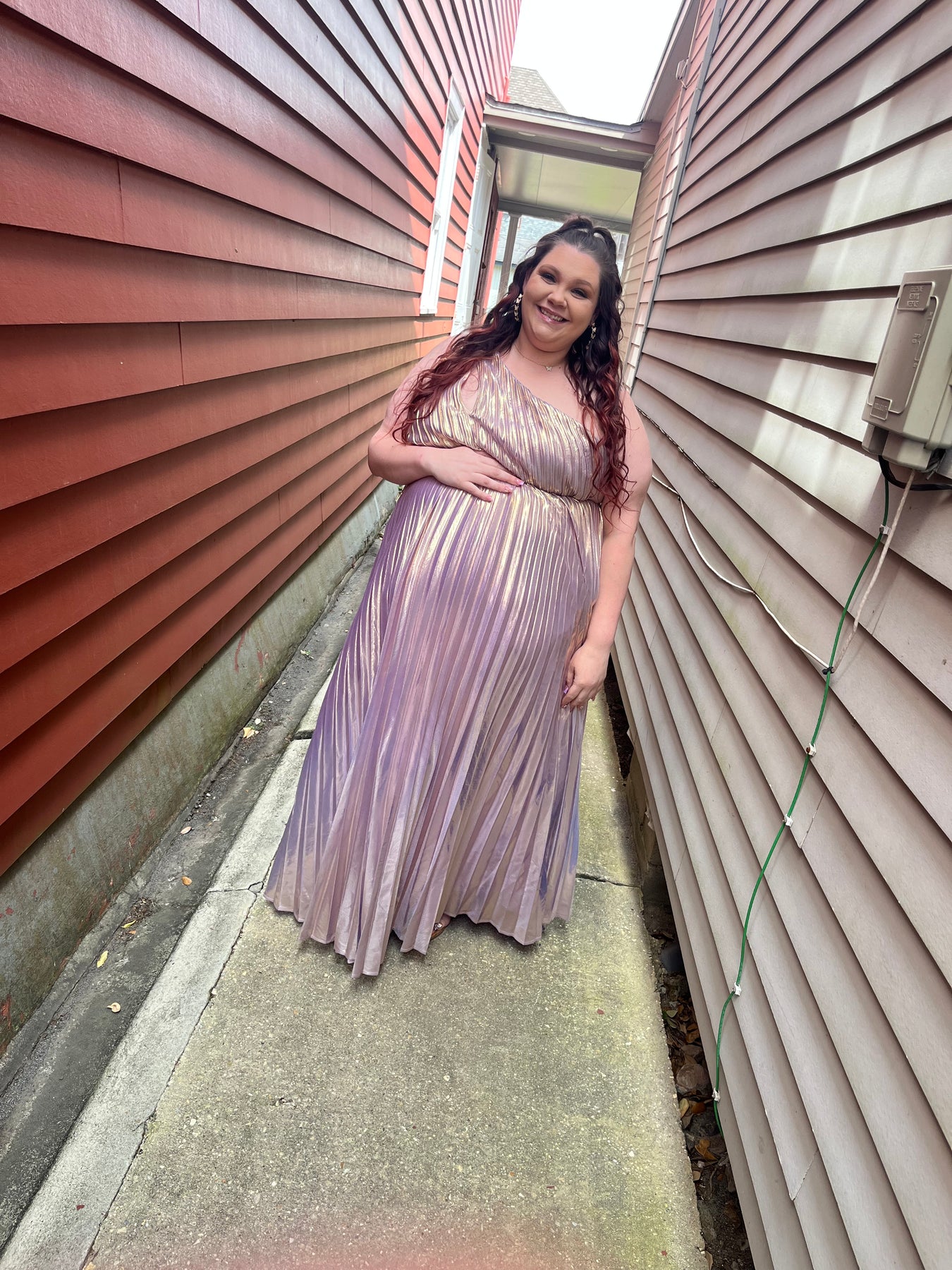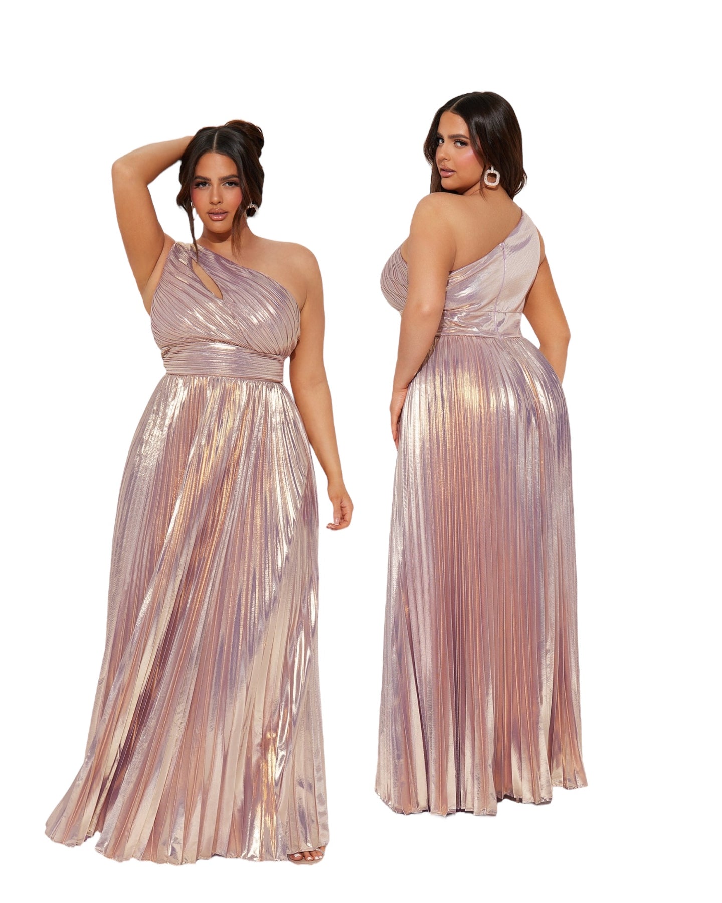 Pleated This Plus Size Pleated Metallic Maxi exudes effortless elegance. The pleated cold shoulder design and floor length silhouette create a flowing, ethereal look. The metallic detailing adds a touch of glamour, while the hidden back zipper and lining ensure a perfect fit. Available in stunning Lavender.